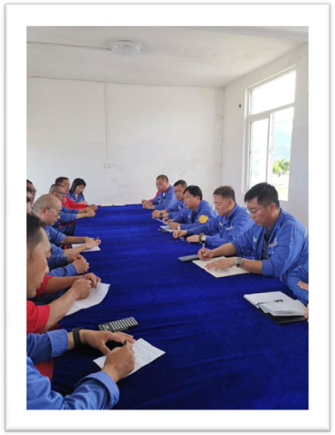 2020年7月25日下午台山项目部召开第一次周例会,由项目经理门猛宣布项目管理人员岗位及其工作职责,并对8月1日开工前重点工作进行安排。