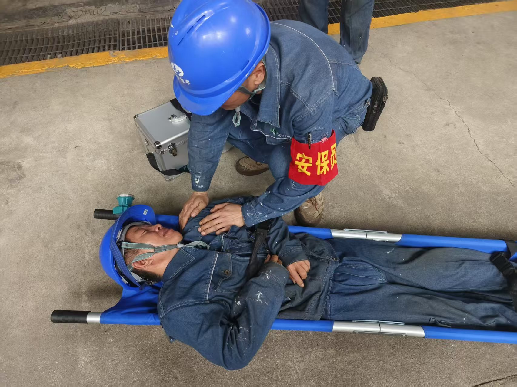 “有人晕倒了!在1机组E磨煤机里!10时,随着现场监护人员的紧急呼救,演练正式开始。现场总指挥张晓舟立即启动应急预案,并命令立即停止周边所有作业。应急小组带着救援设备迅速抵达现场,确认现场环境安全后将晕倒人员成功救出,医疗救援组立即接手,展开专业医疗处置。判断意识状态“脉搏微弱,呼吸急促,初步判断为高温环境下作业导致的热中暑”医护人员的诊断清晰准确。救援人员立即解开中暑人员衣扣,用湿毛巾冷敷头部,同时用酒精擦拭腋窝等部位帮助散热。考虑到晕倒人员可能出现脱水症状,医护人员小心地为其补充含盐水分整个救援过程分工明确、配合默契,从发现晕倒到成功救出仅用时8分钟,充分展现了救援团队的专业素养和应急能力。